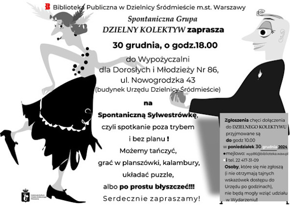 Spontaniczna Grupa DZIELNY KOLEKTYW zaprasza w poniedziałek, 30 grudnia o godzinie 18:00 do Wypożyczalni dla Dorosłych i Młodzieży Nr 86, ul. Nowogrodzka 43 (budynek Urzędu Dzielnicy Śródmieście) na Spontaniczną Sylwestrówkę.