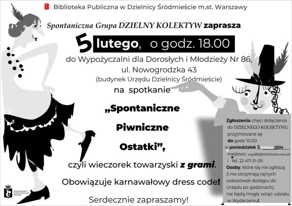 Spontaniczna Grupa DZIELNY KOLEKTYW zaprasza w poniedziałek, 5 lutego o godz. 18:00 do Wypożyczalni dla Dorosłych i Młodzieży Nr 86, ul. Nowogrodzka 43 (budynek Urzędu Dzielnicy Śródmieście) na wieczorek towarzyski z grami. Obowiązuje karnawałowy dress code!