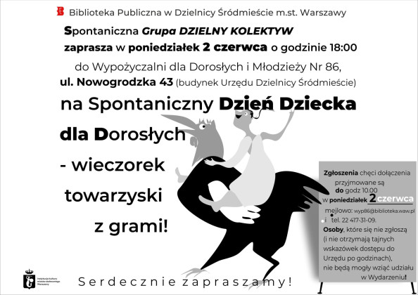 Spontaniczna Grupa DZIELNY KOLEKTYW zaprasza w poniedziałek 2 czerwca o godzinie 18:00 do Wypożyczalni dla Dorosłych i Młodzieży Nr 86, ul. Nowogrodzka 43 (budynek Urzędu Dzielnicy Śródmieście) na Spontaniczny Dzień Dziecka dla Dorosłych - wieczorek towarzyski z grami.