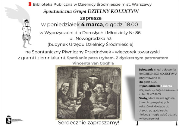 Spontaniczna Grupa DZIELNY KOLEKTYW zaprasza w poniedziałek, 4 marca o godz. 18:00 do Wypożyczalni dla Dorosłych i Młodzieży Nr 86, ul. Nowogrodzka 43 (budynek Urzędu Dzielnicy Śródmieście) na Spontaniczny Piwniczny Przednówek - wieczorek towarzyski z grami i ziemniakami. Spotkanie poza trybem. Z dyskretnym patronatem Vincenta van Gogh'a.