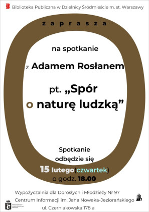 Biblioteka Publiczna w Dzielnicy Śródmieście m.st. Warszawy zaprasza na spotkanie z Adamem Rosłanem pt. "Spór o naturę ludzką".