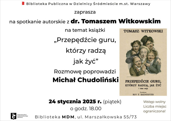 Biblioteka Publiczna w Dzielnicy Śródmieście m.st. Warszawy zaprasza do Biblioteki MDM przy ul. Marszałkowskiej 55/73 na spotkanie autorskie z dr. Tomaszem Witkowskim. Tematem będzie książka "Przepędźcie guru, którzy radzą jak żyć". Rozmowę poprowadzi Michał Chudoliński. Spotkanie odbędzie się 24 stycznia o godzinie 18:00.