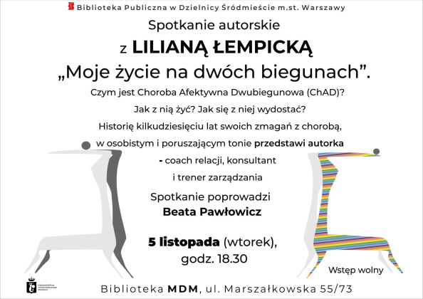 Zapraszamy 5 listopada o godzinie 18:30 na spotkanie autorskie z Lilianą Łempicką do Wypożyczalni dla Dorosłych i Młodzieży Nr 7 z Oddziałem dla Dzieci (Biblioteka MDM) ul. Marszałkowska 55/73.
