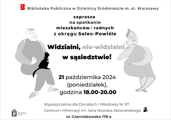 Biblioteka Publiczna w Dzielnicy Śródmieście m.st. Warszawy zaprasza na spotkanie mieszkańców i radnych z okręgu Solec-Powiśle pt."Widzialni, nie-widzialni w sąsiedztwie". Spotkamy się 21 października w godzinach 18:00-20:00 w Wypożyczalni dla Dorosłych i Młodzieży Nr 97 Centrum Informacji im. Jana Nowaka-Jeziorańskiego przy ul. Czerniakowskiej 178 a.