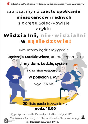 Biblioteka Publiczna w Dzielnicy Śródmieście m.st. Warszawy zaprasza na spotkanie mieszkańców i radnych z okręgu Solec-Powiśle pt. "Widzialni, nie-widzialni w sąsiedztwie". Tym razem będziemy gościć Jędrzeja Dutkiewicza, autora reportażu "Inny dom. Ludzie, system i granice wsparcia w polskich DPS".