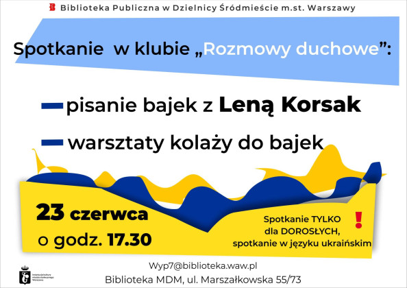 Biblioteka Publiczna w Dzielnicy Śródmieście m.st. Warszawy zaprasza na Spotkanie w klubie "Rozmowy duchowe" (pisanie bajek z Leną Korsak, warsztaty kolaży do bajek). Spotkanie w języku ukraińskim, tylko dla dorosłych odbędzie się 23 czerwca o godzinie 17:30 w Bibliotece MDM (ul. Marszałkowska 55/73).