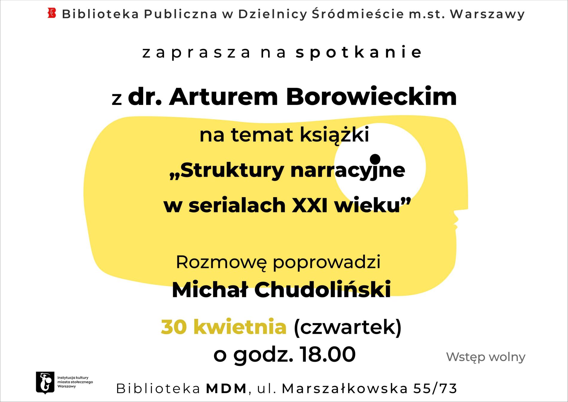 Rozmowę poprowadzi Michał Chudoliński. Spotkanie odbędzie się 30 kwietnia o godzinie 18:00 w Bibliotece MDM przy ul. Marszałkowskiej 55/73.