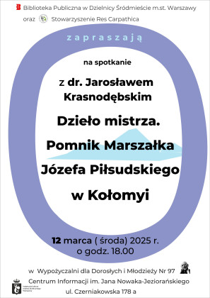 Biblioteka Publiczna w Dzielnicy Śródmieście m.st. Warszawy oraz Stowarzyszenie Res Carpathica zapraszają na spotkanie z dr. Jarosławem Krasnodębskim pt. "Dzieło mistrza. Pomnik Marszałka Józefa Piłsudskiego w Kołomyi".