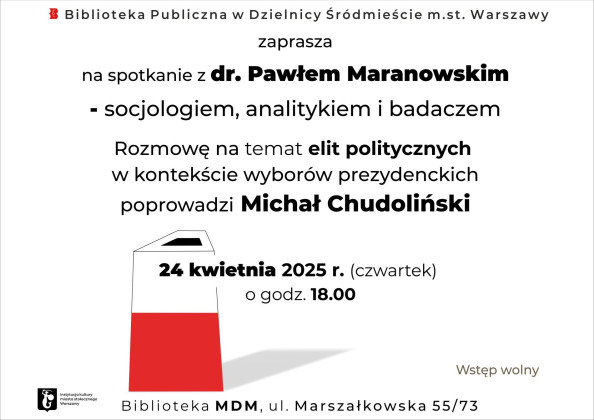 Biblioteka Publiczna w Dzielnicy Śródmieście m.st. Warszawy zaprasza na spotkanie z dr. Pawłem Maranowskim - socjologiem, analitykiem i badaczem. Rozmowę na temat elit politycznych w kontekście wyborów prezydenckich poprowadzi Michał Chudoliński.