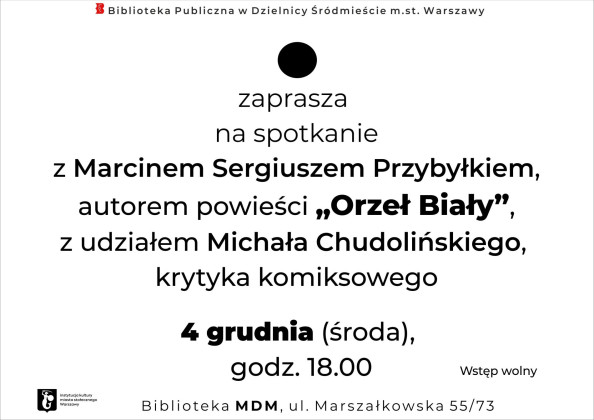 Zapraszamy 4 grudnia o godzinie 18:00 na spotkanie z Marcinem Sergiuszem Przybyłkiem, autorem powieści "Orzeł Biały", z udziałem Michała Chudolińskiego, krytyka komiksowego. Spotkamy się w Wypożyczalni dla Dorosłych i Młodzieży Nr 7 z Oddziałem dla Dzieci (Biblioteka MDM) ul. Marszałkowska 55/73.
