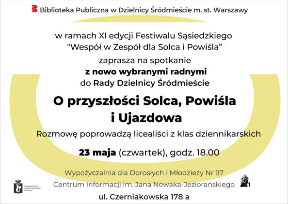 Wypożyczalnia dla Dorosłych i Młodzieży Nr 97 Centrum Informacji im. Jana Nowaka-Jeziorańskiego (ul. Czerniakowska 178 a) zaprasza na spotkanie z nowo wybranymi radnymi do Rady Dzielnicy Śródmieście z okręgu wyborczego nr 1 obejmującego swoim zasięgiem Solec, Powiśle i Ujazdów.