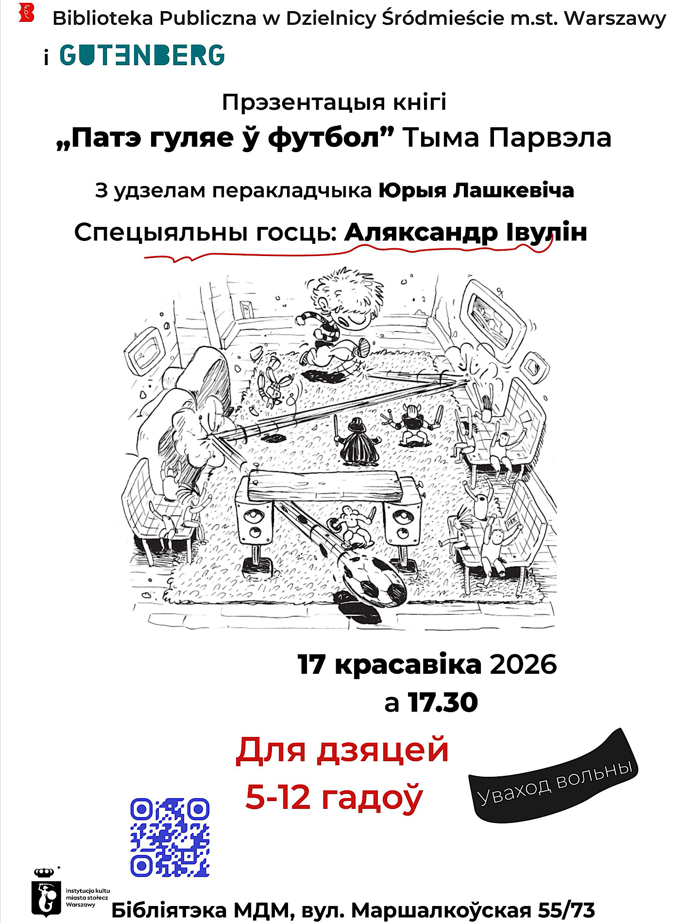 Biblioteka Publiczna w Dzielnicy Śródmieście m.st. Warszawy i Gutenberg zapraszają na spotkanie dla dzieci i rodziców z Yuryjem Lashkievichem, białoruskim tłumaczem książki "Pate gra w piłkę" Timo Parvela.
