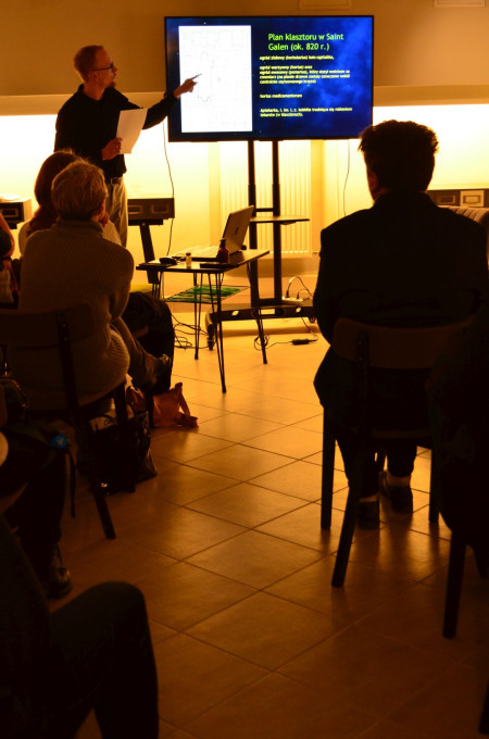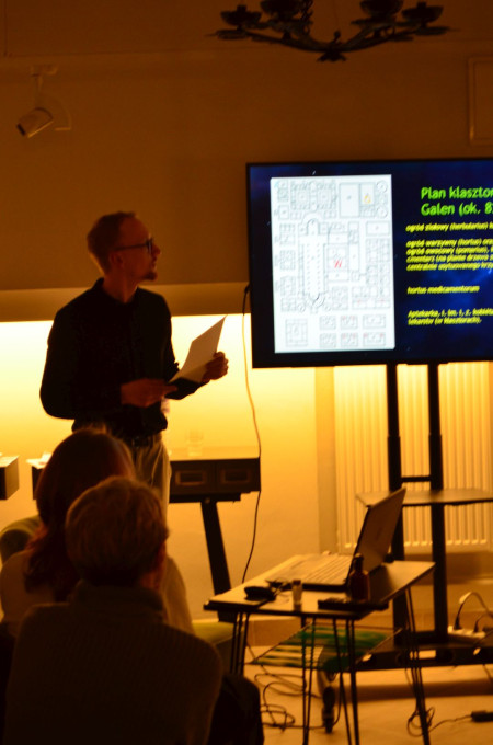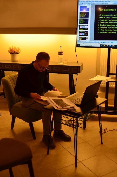 Marek Łuszczyk poprowadził nas ścieżkami rozwoju medycyny na przestrzeni wieków od początków cywilizacji ludzkiej poczynając. Wykład opatrzony ciekawostkami, anegdotami i cytatami otwierał wyobraźnię na zmiany cywilizacyjne, jakie dokonały się przez tysiące lat. Od pierwszych prób szukania sposobów na ratowanie zdrowia, które świadczyły o instynkcie społecznym, wspólnotowym do dzisiaj, gdzie korzystając z doświadczeń przodków wciąż modyfikujemy i udoskonalamy nasza dbałość o zdrowie.