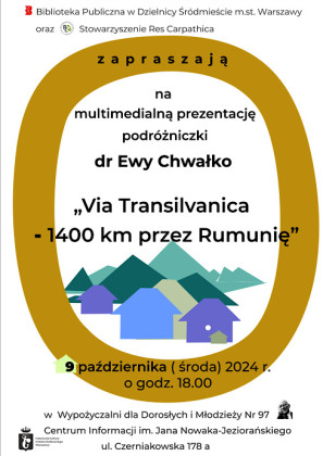 Biblioteka Publiczna w Dzielnicy Śródmieście m.st. Warszawy oraz Stowarzyszenie Res Carpathica zapraszają na multimedialną prezentację podróżniczki dr Ewy Chwałko "Via Transilvanica - 1400 km przez Rumunię”.
