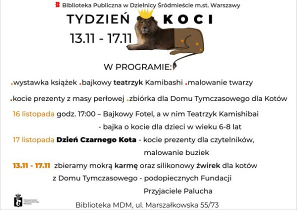 W dniach 13-17 listopada w Wypożyczalni dla Dorosłych i Młodzieży nr 7 z Oddziałem dla Dzieci - Bibliotece MDM (ul. Marszałkowska 55/73) odbędzie się Tydzień koci.