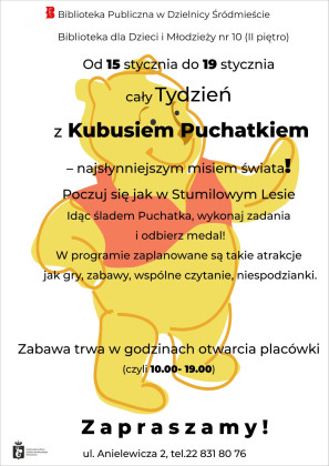 Na spotkanie z Kubusiem Puchatkiem zapraszamy w dniach 15-19 stycznia. Szukajcie go w Bibliotece dla Dzieci i Młodzieży nr 10 w godzinach 10:00 – 19:00 przy ul. Anielewicza 2. Czekają Was gry, zabawy, wspólne czytanie, Stumilowoleśne Zadania Do Wykonania, oraz inne Kubusiowe Niespodzianki.