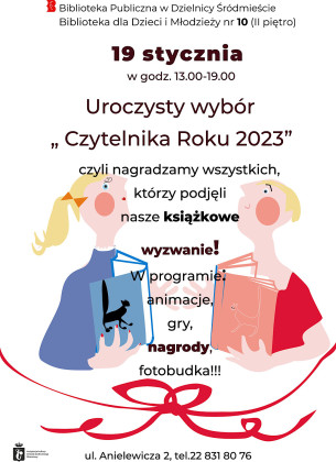Zapraszamy 19 stycznia w godzinach 13:00-19:00 do Biblioteki nr 10 przy ul. Anielewicza 2 na uroczysty wybór Czytelnika Roku 2023. Nagradzamy wszystkich, którzy podjęli nasze książkowe wyzwanie. W programie gry, animacje, nagrody, fotobudka.