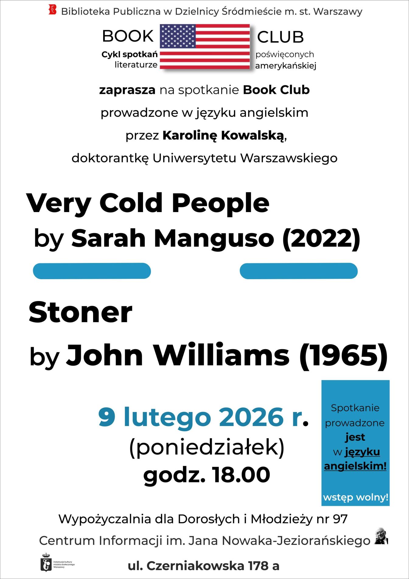 Podczas spotkania omawiane będą książki: "Very Cold People" by Sarah Manguso (2022); "Stoner" by John Williams (1965).