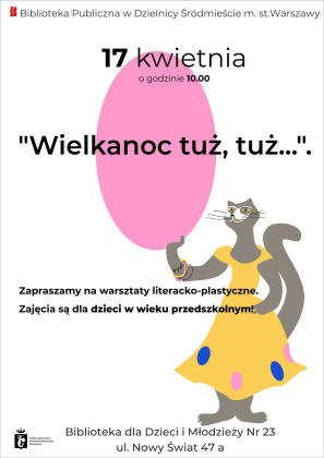 Biblioteka dla Dzieci i Młodzieży Nr 23 (ul. Nowy Świat 47 a) zaprasza dzieci w wieku przedszkolnym na warsztaty literacko-plastyczne. Spotkamy się 17 kwietnia o godzinie 10:00.