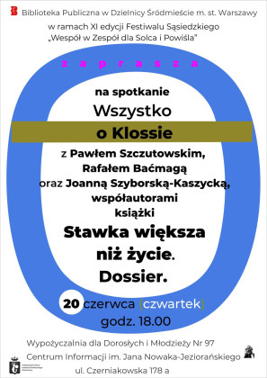 Biblioteka Publiczna w Dzielnicy Śródmieście m.st. Warszawy, w ramach XI edycji Festiwalu Sąsiedzkiego Wespół w Zespół dla Solca i Powiśla, zaprasza na spotkanie pt. "Wszystko o Klossie" z Pawłem Szczutowskim, Rafałem Baćmagą oraz Joanną Szyborską-Kaszycką, współautorami książki "Stawka większa niż życie. Dossier".