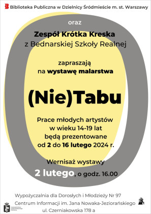 Biblioteka Publiczna w Dzielnicy Śródmieście m.st. Warszawy oraz Zespół Krótka Kreska z Bednarskiej Szkoły Realnej zapraszają na wystawę malarstwa pt. "(Nie)Tabu".