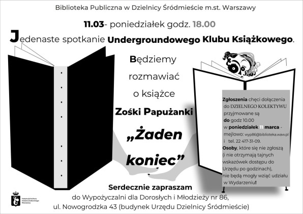 Wypożyczalnia dla Dorosłych i Młodzieży Nr 86, ul. Nowogrodzka 43 (budynek Urzędu Dzielnicy Śródmieście) zaprasza w poniedziałek 11 marca o godzinie 18:00 na jedenaste spotkanie Undergroundowego Klubu Książkowego.