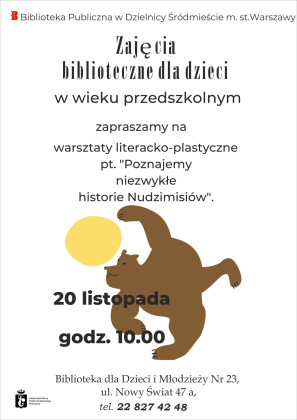 Zapraszamy w dniu 20 listopada o godzinie 10:00 na zajęcia biblioteczne dla dzieci w wieku przedszkolnym. Warsztaty literacko-plastyczne pt. "Poznajemy niezwykłe historie Nudzimisiów" odbędą się w Bibliotece dla Dzieci i Młodzieży Nr 23 przy ul. Nowy Świat 47a.