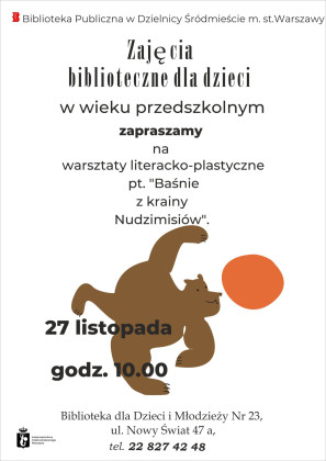 Zapraszamy w dniu 27 listopada o godzinie 10:00 na zajęcia biblioteczne dla dzieci w wieku przedszkolnym. Warsztaty literacko-plastyczne pt. "Baśnie z krainy Nudzimisiów" odbędą się w Bibliotece dla Dzieci i Młodzieży Nr 23 przy ul. Nowy Świat 47a.