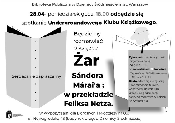Wypożyczalnia dla Dorosłych i Młodzieży Nr 86, ul. Nowogrodzka 43 (budynek Urzędu Dzielnicy Śródmieście) zaprasza w poniedziałek 28 kwietnia o godzinie 18:00 na spotkanie Undergroundowego Klubu Książkowego. Porozmawiamy o książce "Żar" - Sándora Márai'a ; w przeł. Feliksa Netza.