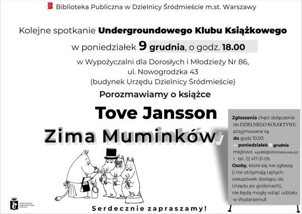 Wypożyczalnia dla Dorosłych i Młodzieży Nr 86, ul. Nowogrodzka 43 (budynek Urzędu Dzielnicy Śródmieście) zaprasza w poniedziałek 9 grudnia o godzinie 18:00 na spotkanie Undergroundowego Klubu Książkowego. Porozmawiamy o książce "Zima Muminków" Tove Jansson.