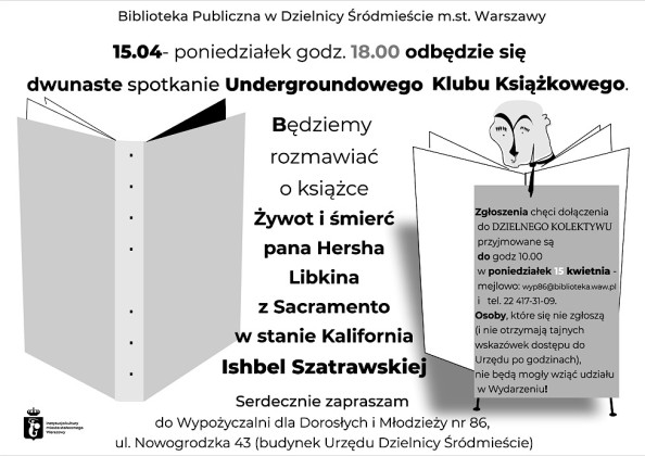 Wypożyczalnia dla Dorosłych i Młodzieży Nr 86, ul. Nowogrodzka 43 (budynek Urzędu Dzielnicy Śródmieście) zaprasza w poniedziałek 15 kwietnia o godzinie 18:00 na dwunaste spotkanie Undergroundowego Klubu Książkowego.