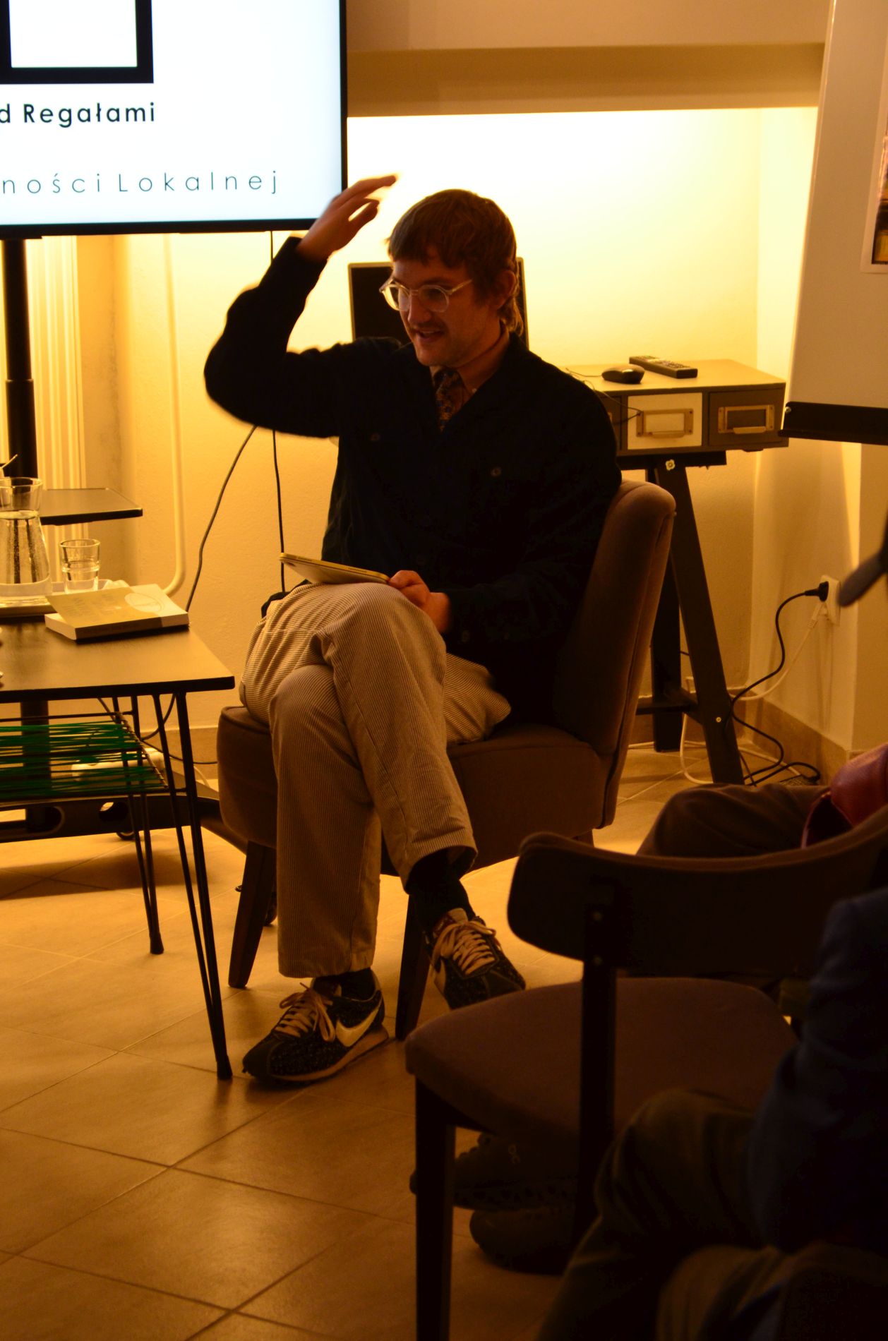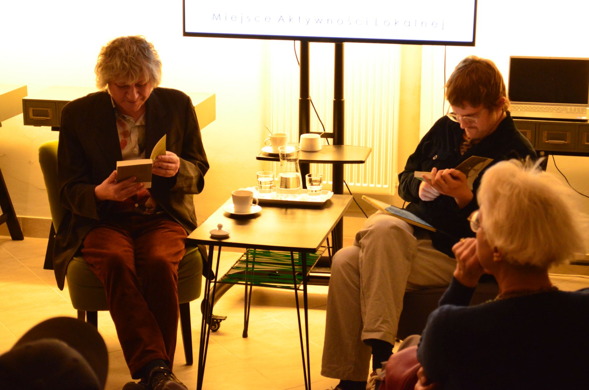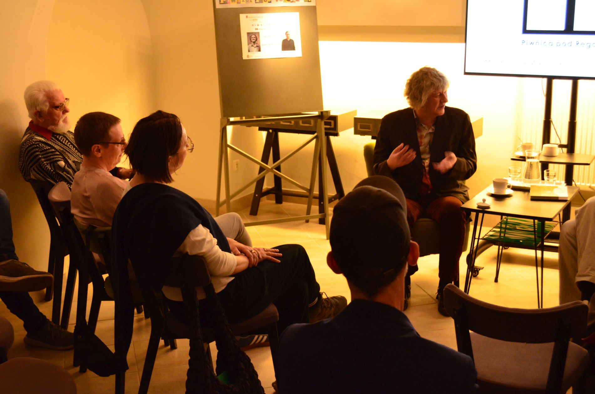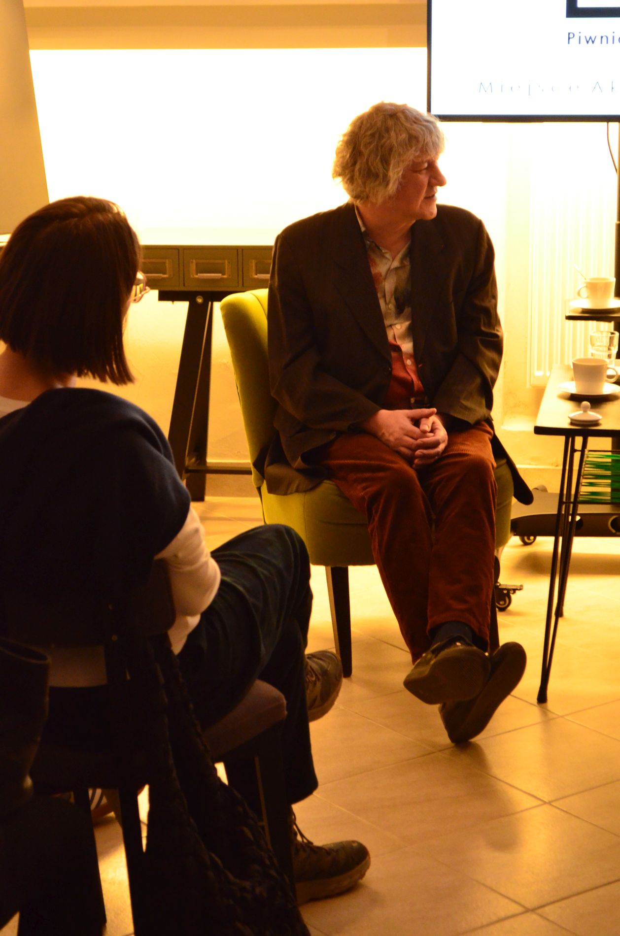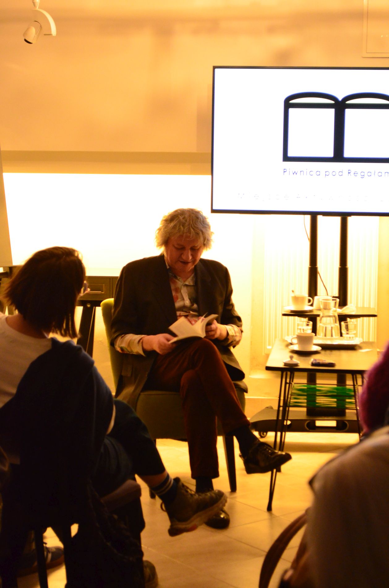 Słuchacze wieczoru z Adamem Wiedemannem licznie wypełnili "Piwnicę pod Regałami". Zapewne, motywowani także ciekawością, jak autor odnajdzie się w roli gościa PIWNICY POETÓW. Wszak był tu od zawsze obecny jako prowadzący. I rzeczywiście, było nietypowo. Adam Wiedemann skupił się na swojej ostatnio wydanej książce "Jedzmy zwracajmy", a naprowadzany pytaniami Jakuba Nowackiego odsłaniał to, co nas czytelników zawsze pociąga – swoją prawdziwą naturę. Nowacki uważa, że Wiedemann "...pozostaje wierny jednej tylko sprawie: autonomii sztuki, która jest dla niego przestrzenią prawdziwej, radykalnej wolności...". Trzeba mu przyznać rację, bo wieczór był pełen wzruszeń, zadumy, prawdziwego śmiechu i naturalności, do których lgniemy spotykając prawdziwą szczerość.