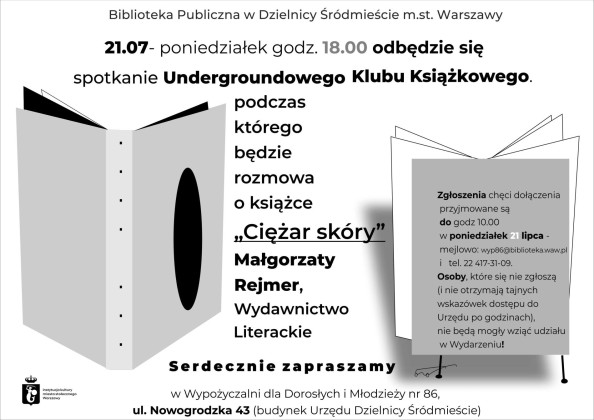 Wypożyczalnia dla Dorosłych i Młodzieży Nr 86, ul. Nowogrodzka 43 (budynek Urzędu Dzielnicy Śródmieście) zaprasza w poniedziałek 21 lipca o godzinie 18:00 na spotkanie Undergroundowego Klubu Książkowego. Porozmawiamy o książce "Ciężar skóry" Małgorzaty Rejmer.