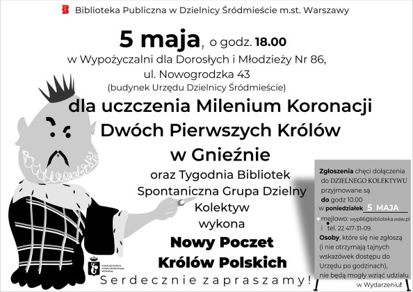 Spontaniczna Grupa DZIELNY KOLEKTYW zaprasza w poniedziałek 5 maja o godzinie 18:00 do Wypożyczalni dla Dorosłych i Młodzieży Nr 86, ul. Nowogrodzka 43 (budynek Urzędu Dzielnicy Śródmieście) na spotkanie dla uczczenia Milenium Koronacji Dwóch Pierwszych Królów w Gnieźnie oraz Tygodnia Bibliotek.
