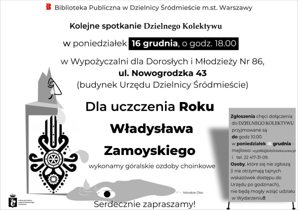 Spontaniczna Grupa DZIELNY KOLEKTYW zaprasza w poniedziałek, 16 grudnia o godzinie 18:00 do Wypożyczalni dla Dorosłych i Młodzieży Nr 86, ul. Nowogrodzka 43 (budynek Urzędu Dzielnicy Śródmieście) na spotkanie dla uczczenia Roku Władysława Zamoyskiego. Wykonamy góralskie ozdoby choinkowe.