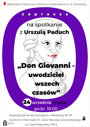 Biblioteka Publiczna w Dzielnicy Śródmieście m.st. Warszawy zaprasza na spotkanie z Urszulą Paduch pt. "Don Giovanni - uwodziciel wszech czasów".
