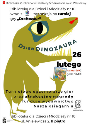 Z okazji Dnia Dinozaura Biblioteka dla Dzieci i Młodzieży nr 10 (ul. Anielewicza 2) zaprasza na turniej gry "Draftozaur". Spotkamy się 26 lutego o godzinie 16:00.
