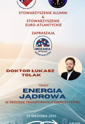 Stowarzyszenie Alumni & Stowarzyszenie Euro-Atlantyckie zapraszają na spotkanie. Gościem będzie doktor Łukasz Tolak, temat spotkania: Energia jądrowa w procesie transformacji energetycznej.