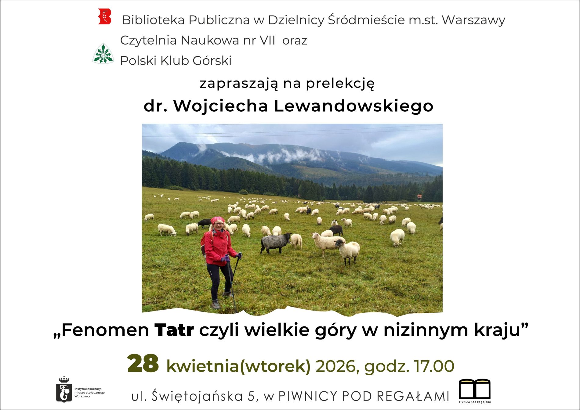 Czytelnia Naukowa Nr VII oraz Polski Klub Górski zapraszają 28 kwietnia o godzinie 17:00 na prelekcję dr. Wojciecha Lewandowskiego pt. "Fenomen Tatr czyli wielkie góry w nizinnym kraju". Spotkamy się w Piwnicy pod Regałami przy ul. Świętojańskiej 5.