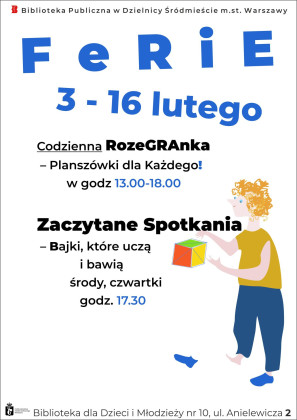 Biblioteka Nr 10 przy ul. Anielewicza 2 zaprasza na Ferie. Codzienna Rozegranka - planszówki dla każdego w godzinach 13:00-18:00 oraz Zaczytane spotkania - bajki, które uczą i bawią w środy i czwartki godzina 17:30.
