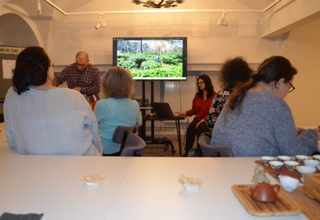 Czwartkowe spotkanie "Gdzie niebo łączy się z ziemią – herbaciana podróż do Tajlandii" poprowadziła pasjonatka tego napoju - Małgorzata Grunduls. Zabrała ona gości "Piwnicy pod Regałami" w osobistą podróż przez cztery azjatyckie plantacje krzewów herbaty. Opowieściom z wyprawy towarzyszyły fotografie z niezwykłych spotkań i miejsc. Zdjęcia cieszyły oczy, a podniebienia rozgrzewały dwa gatunki świeżo parzonego ulunga z gór dawnego królestwa Syjamu. Aromat i smak herbaty podawanej w delikatnych czarkach, kandyzowany imbir... Autorce i "Towarzystwu Pełnej Czarki" za wiele doznań cieszących zmysły serdecznie dziękujemy.