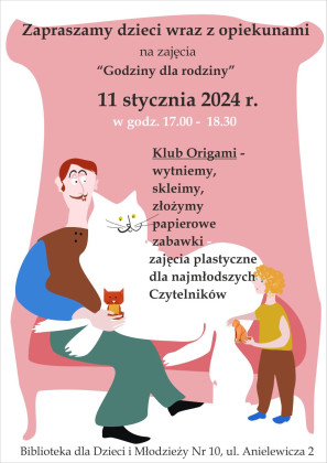Biblioteka dla Dzieci i Młodzieży Nr 10, ul. Anielewicza 2 zaprasza dzieci wraz z opiekunami dnia 11 stycznia w godzinach 17:30-18:00 na "Godziny dla Rodziny" – zajęcia plastyczne dla najmłodszych Czytelników.