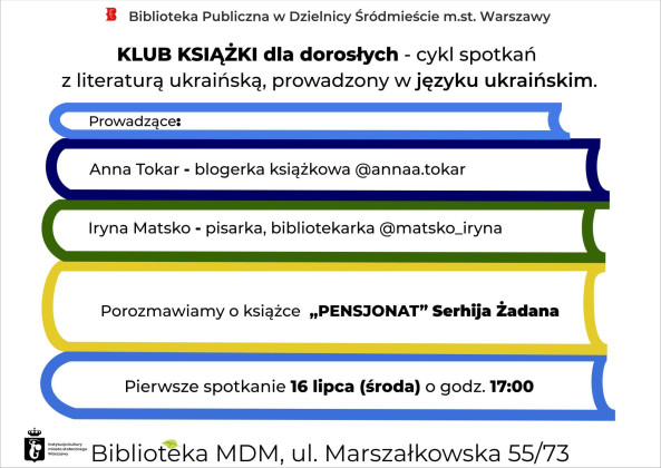 Biblioteka Publiczna w Dzielnicy Śródmieście m.st. Warszawy zaprasza na Klub Książki Ukraińskiej dla dorosłych - cykl spotkań z literaturą ukraińską, prowadzony w języku ukraińskim.