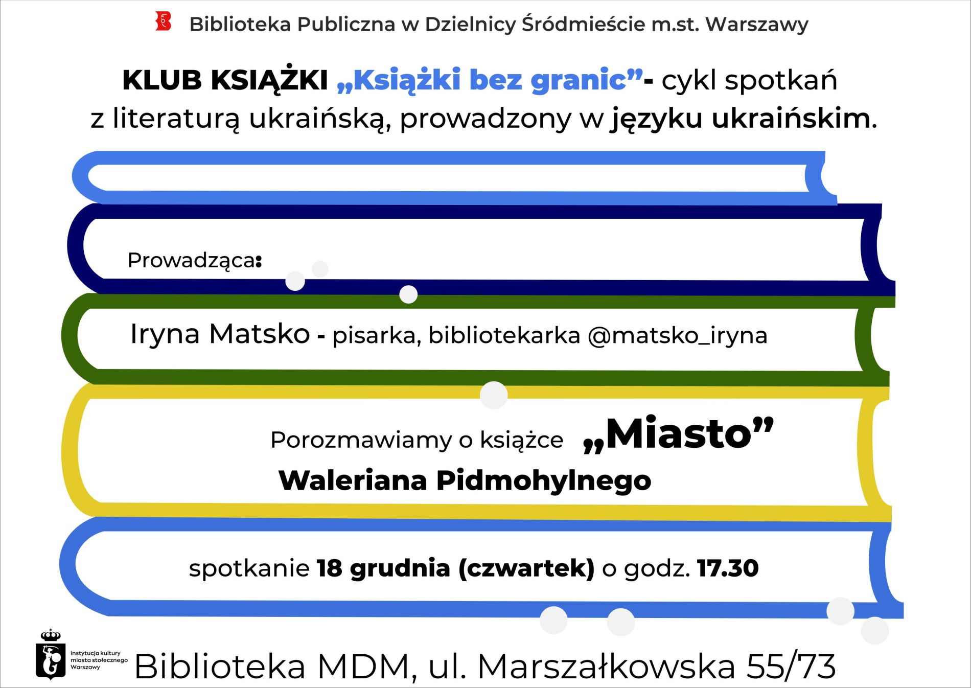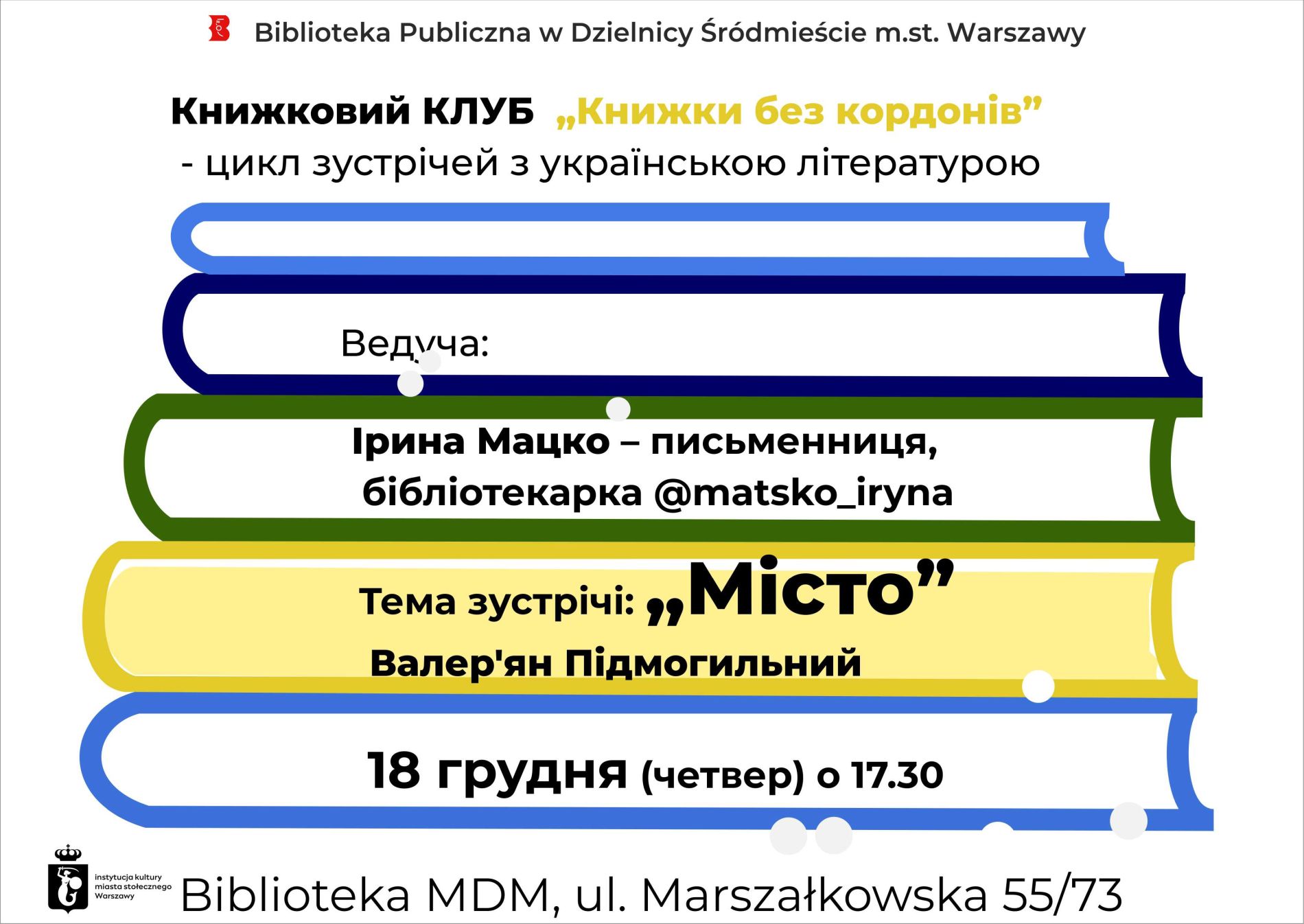 Biblioteka Publiczna w Dzielnicy Śródmieście m.st. Warszawy zaprasza na Klub Książki Ukraińskiej dla dorosłych - cykl spotkań z literaturą ukraińską, prowadzony w języku ukraińskim. Prowadząca: Iryna Matsko - pisarka, bibliotekarka.