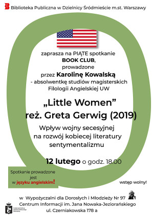 Na spotkaniu "Little Women" (rez. Greta Gerwig) 12 lutego o godzinie 18:00 omówimy wpływ wojny secesyjnej na rozwój kobiecej literatury sentymentalizmu.