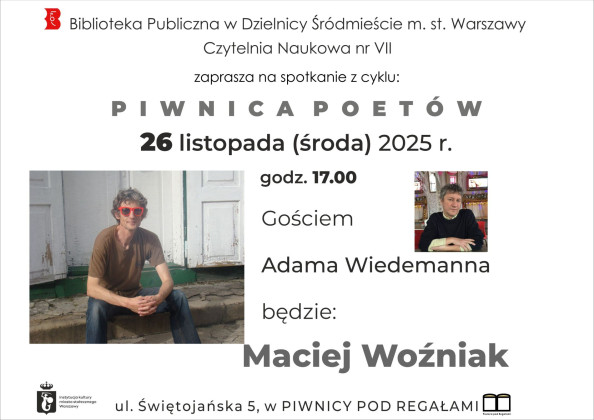 Maciej Woźniak to człowiek-instytucja, nie tylko wybitny poeta, lecz także bibliotekarz i organizator życia kulturalnego w Płocku, a zwłaszcza juror niezliczonych konkursów poetyckich (w których sam wcześniej otrzymał wiele nagród), w związku z czym jego własną twórczość charakteryzuje wielkie staranie o doskonałość zarówno każdego wiersza, jak i każdej książki, są to więc zawsze istne popisy maestrii, pełne najróżniejszych symetrii i autoodniesień, które wykrywamy zwykle dopiero podczas kolejnej lektury. Poezja Woźniaka to jednak nie tylko pokaz kunsztu, lecz także bogatej wyobraźni oraz erudycji autora, będącego wnikliwym znawcą zarówno literatury, jak i muzyki (liczę na to, że podczas naszego wieczorku usłyszymy świetne wiersze o takich postaciach jak Pablo Casals, Światosław Richter czy Josef Szigeti), a także zapalonym wędkarzem (o czym zapewne również porozmawiamy). Naszą najbaczniejszą uwagę przyciągnie jednak chyba najnowsza publikacja płockiego poety, której tematem jest wojna za wschodnią granicą, jednak nie traktowana naiwnościowo, jak to zwykle bywa, lecz widziana z wielu różnych szerokich perspektyw: historycznej, filozoficznej, artystycznej, jak i tej najzupełniej prywatnej, domowej. Książka będąca tyleż diariuszem, co i traktatem, oczywiście antywojennym, bo jakże by inaczej?