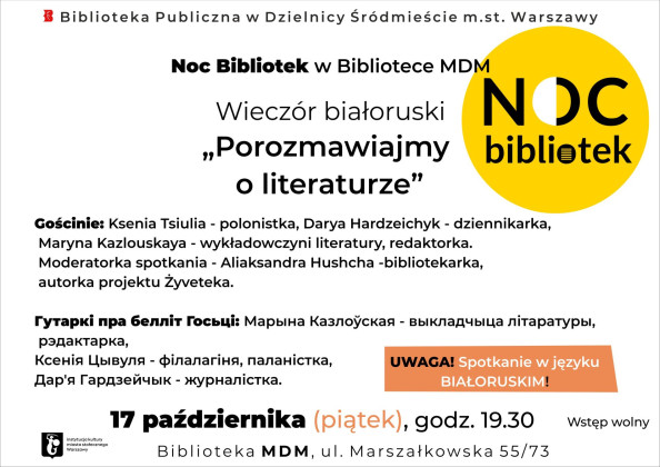 Zapraszamy na Noc Bibliotek w Bibliotece MDM i Wieczór Białoruski "Porozmawiajmy o literaturze".