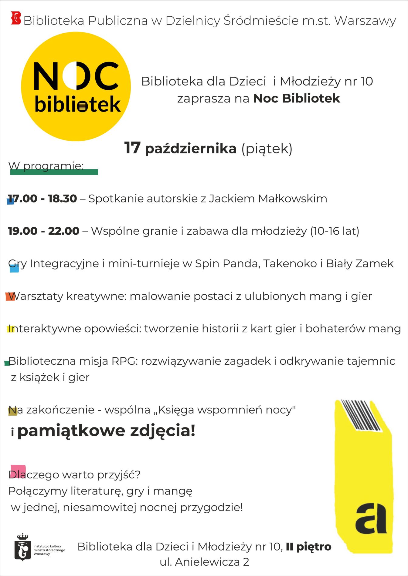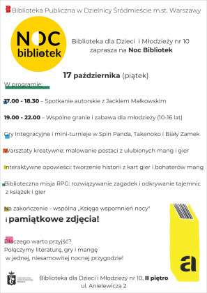 Biblioteka Publiczna w Dzielnicy Śródmieście m.st. Warszawy zaprasza na Noc Bibliotek w Bibliotece dla Dzieci i Młodzieży Nr 10 (ul. Anielewicza 2).