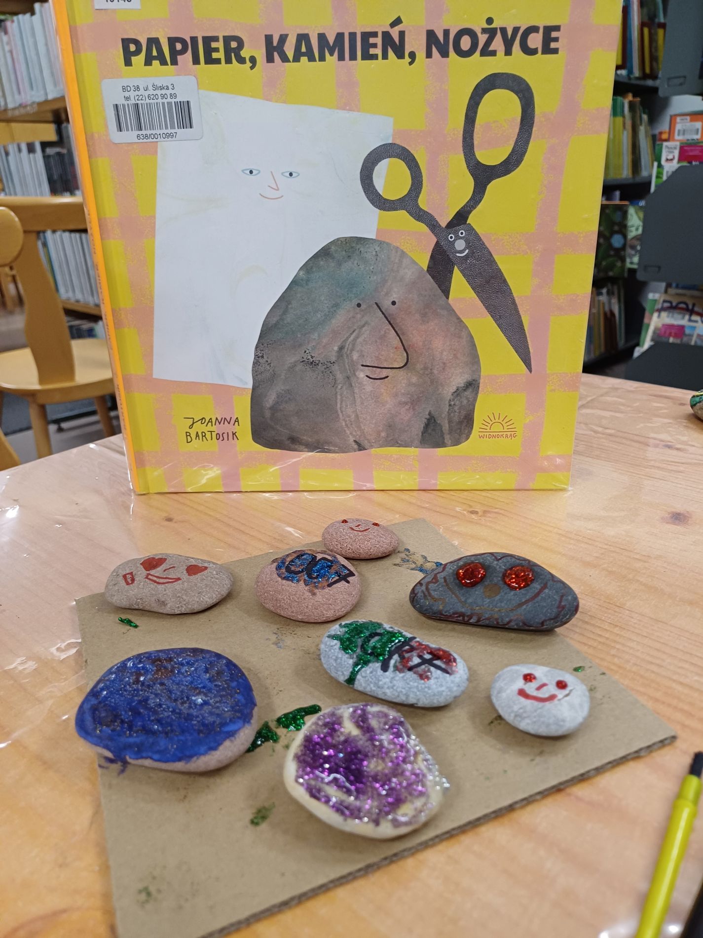 O tym, że współdziałanie ma moc przekonali nas tytułowi bohaterowie książki Joanny Bartosik. Papier, Kamień, Nożyce to także znana gra, od której rozpoczęliśmy październikowe spotkanie. Uczestnicy Poczytajek mieli również za zadanie odnalezienie kamieni ukrytych w różnych zakamarkach naszej Biblioteki, a następnie ich ozdobienie. Wszystko odbyło się w duchu współpracy i wzajemnej pomocy.