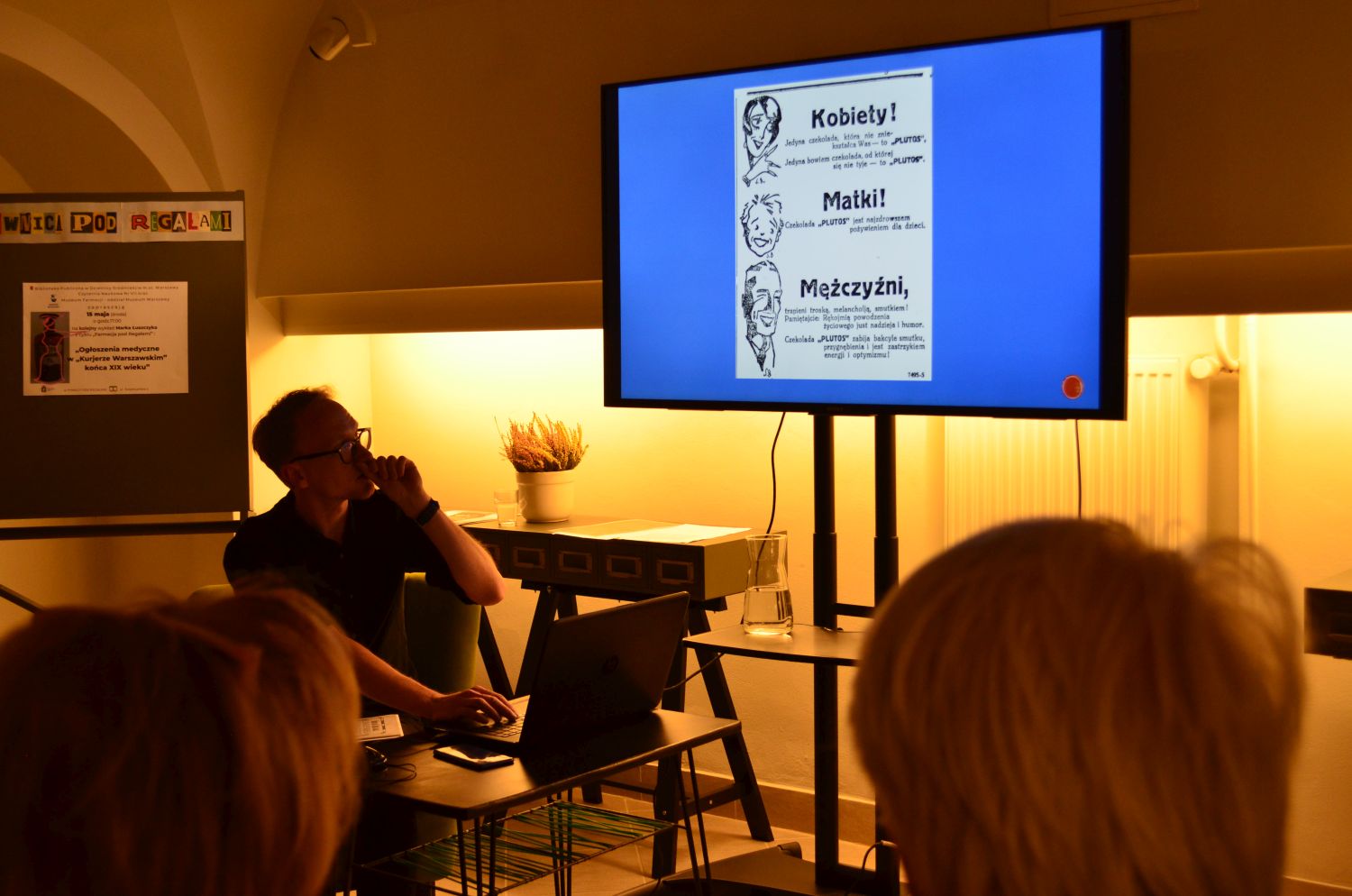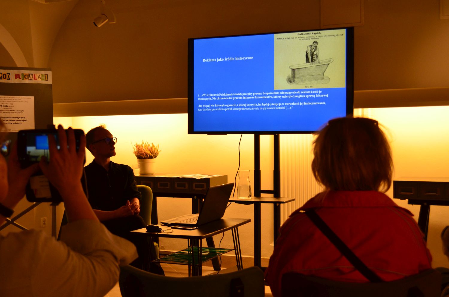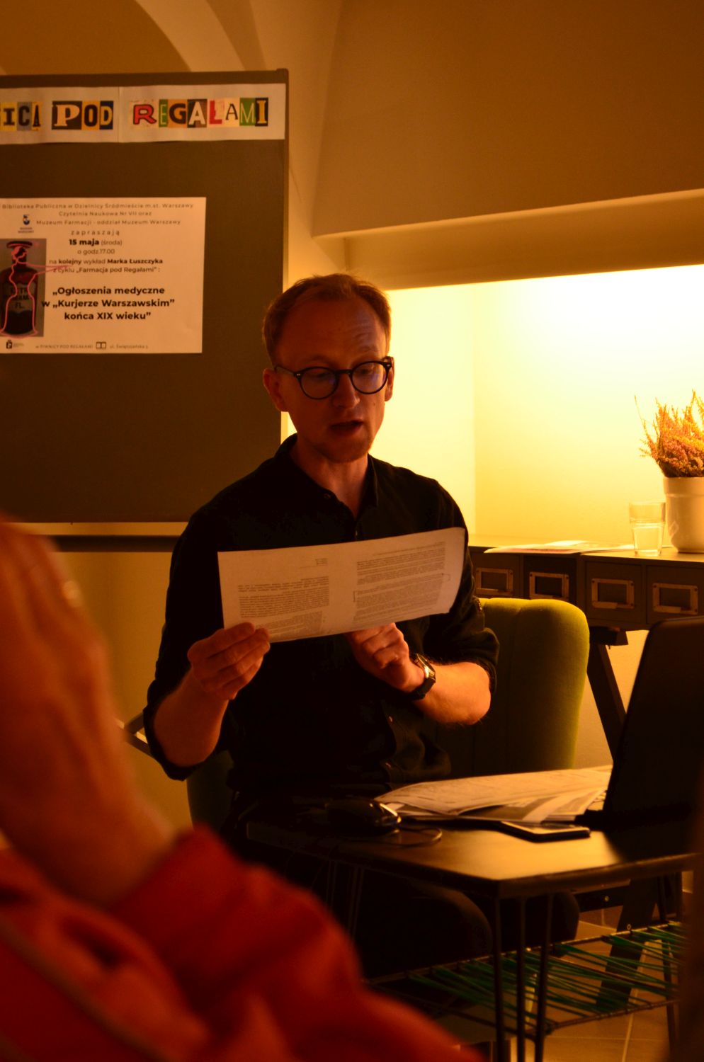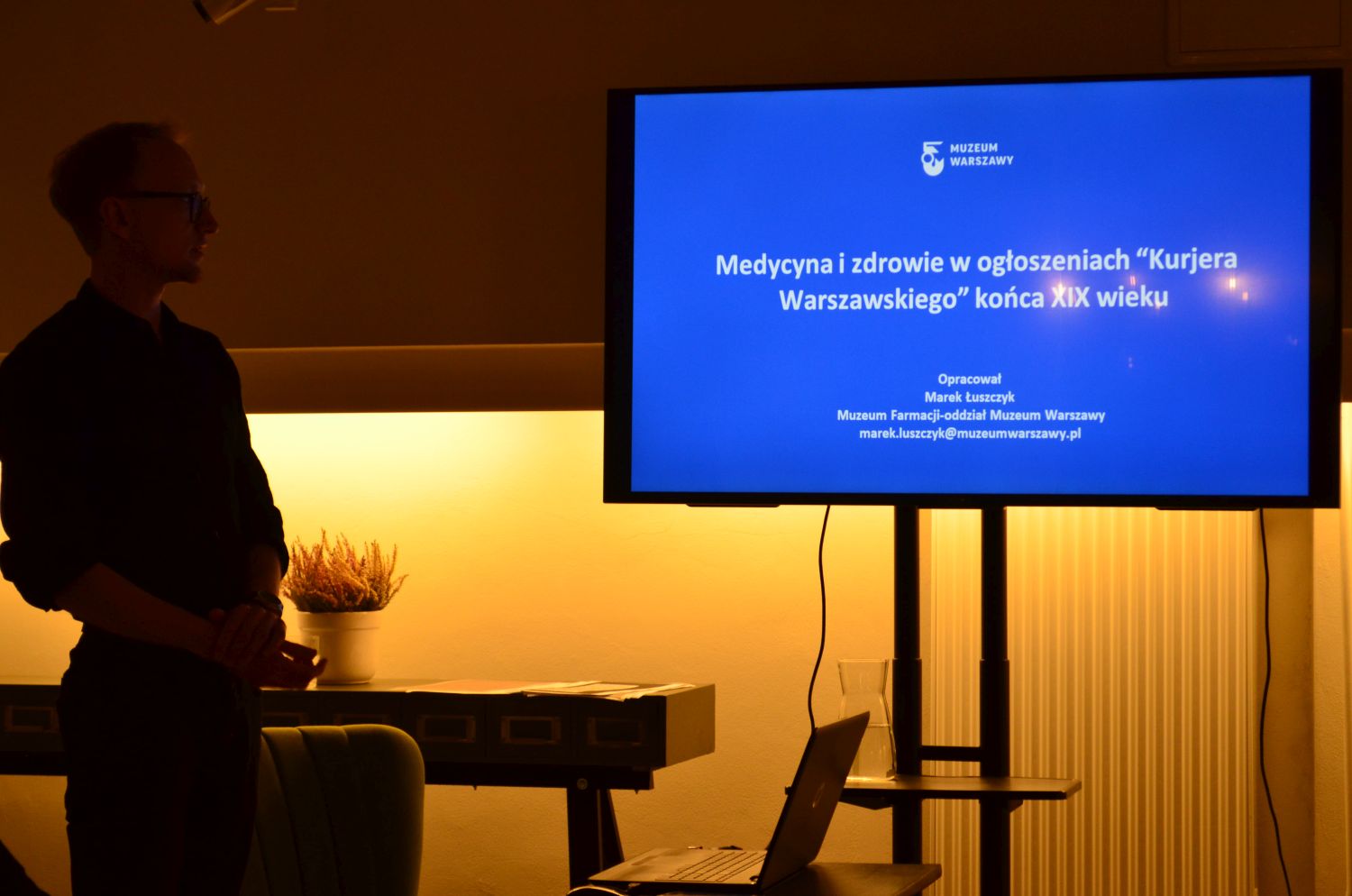 O tym czego można się dowiedzieć z ogłoszeń w gazecie opowiedział Marek Łuszczyk podczas czwartego już spotkania w cyklu „Farmacja pod Regałami” 15 maja 2024 roku. Cykl realizowany jest w „Piwnicy pod Regałami” przez Muzeum Farmacji (oddział Muzeum Warszawy) ul. Piwna 31/33 oraz Czytelnię Naukową Nr VII (Biblioteki Publicznej dla Dzielnicy Śródmieście m. st. Warszawy). Lektura ogłoszeń prasowych jest niezwykle intrygująca. To prawda płynąca zarówno z treści, stylu, grafiki, a także miejsca zamieszczonego ogłoszenia. Można wiele wnioskować o potrzebach zdrowotnych czytelników. Dzisiaj, gdy patrzymy z dystansem na oferowane usługi zdrowotne, musimy pamiętać o stopniu rozwoju cywilizacyjnego i społecznego na przełomie XIX i XX w. Była to bardzo ciekawa lekcja historii pobudzająca do refleksji o nas samych – współczesnych.